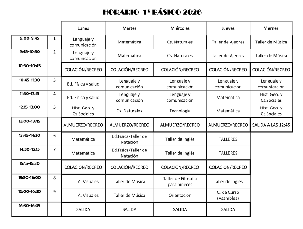 1° Básico Lunes Martes Miércoles Jueves Viernes