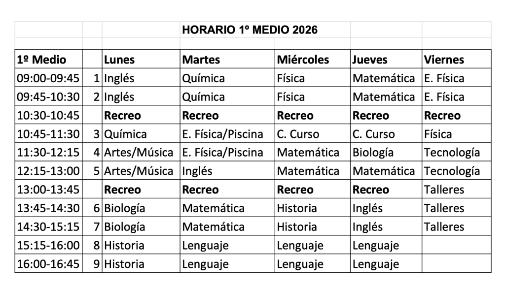 Horario de Clases 1° Medio 2026